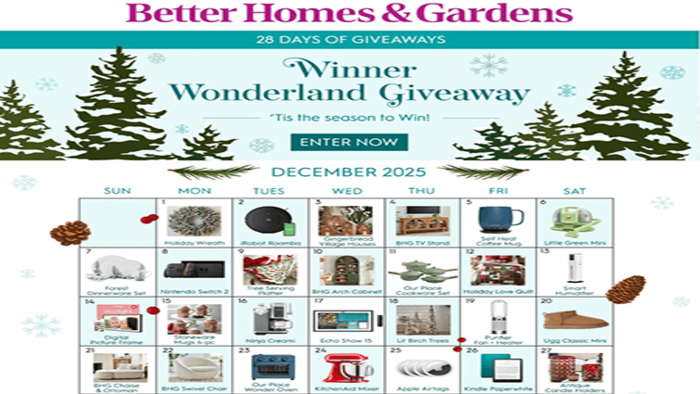Enter daily for a chance to win the Better Home & Gardens The Winner Wonderland Giveaway 2025! Ends on December 28 2025. PRIZES (28): One (1) prize awarded per Daily Entry Period: Calendar Date Daily Entry Period Prize 12/1/25 1 Holiday Wreath, Approximate Retail Value (“ARV”) $397.00 12/2/25 2 iRobot Roomba, ARV $398.99 12/3/25 3 Gingerbread Village