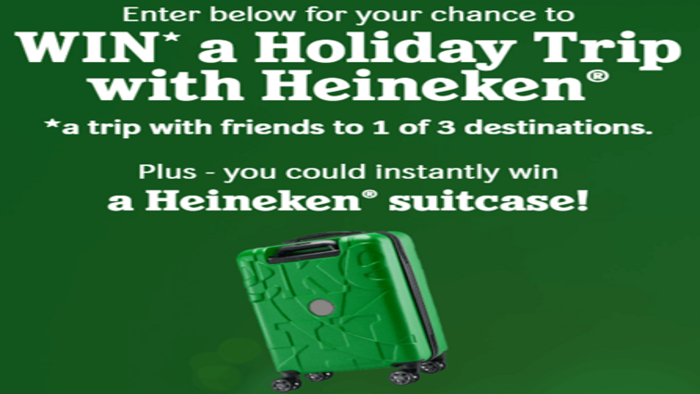 Enter daily for your chance to win the Heineken Holiday Instant Win Game and Sweepstakes! Ends December 31, 2025. Good Luck! PRIZES –Instant Win Prizes (50): Each winner will receive one Heineken suitcase. (ARV: $75 each) One Grand Prize winner will win a trip for four to winner’s choice of Los Angeles, CA; Miami, FL; or