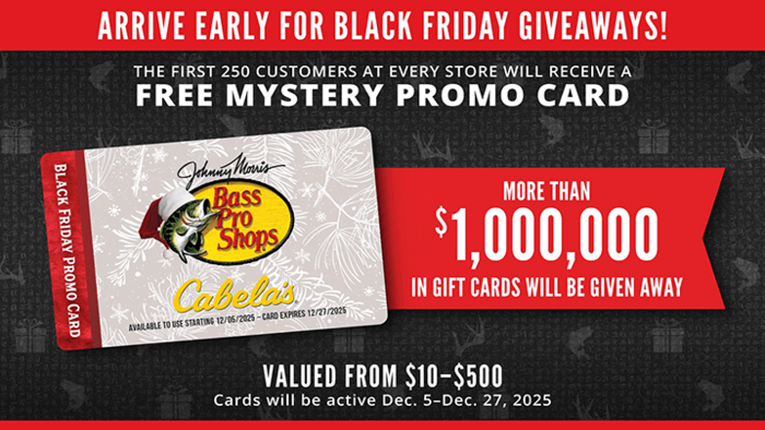 On Friday, November 28, 2025. The first 250 people (age 16+) to enter participating Bass Pro Shops and Cabela’s stores will receive a gift card ranging in value from $10 – $500 and valid for use December 5 – December 27, 2025. Gift cards are available while supplies last. Participation is first come, first served, and is