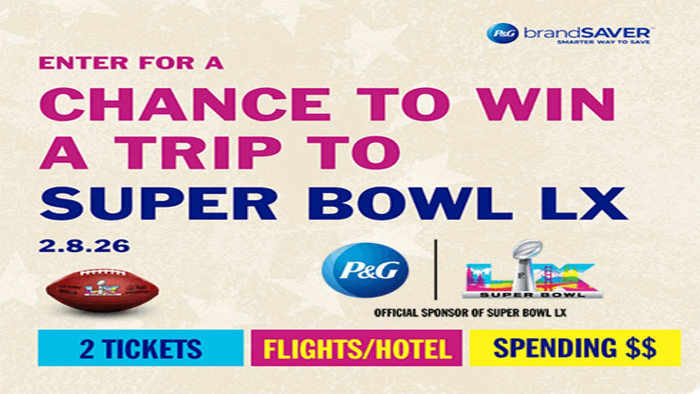 Enter for a chance to win the P&G brandSAVER Super Bowl LX Sweepstakes! Ends on January 13, 2026. P&G brandSAVER is giving away 2 tickets to Super Bowl LX in Santa Clara, CA, along with flights, hotels and spending money! This is P&G brandSAVER’s largest sweepstakes ever, with the prize valued at over $20,000. Prize details: